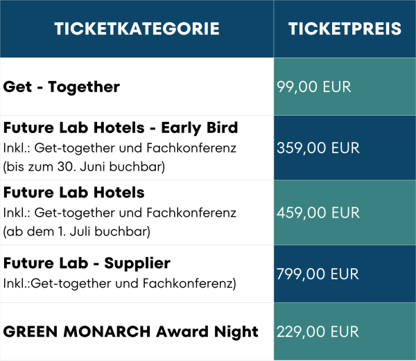 Das Future Lab Hotel Ticket ist bis 30. Juni zum Early-Bird-Preis von 359 EUR erhältlich. Ab 1. Juli gilt der reguläre Preis von 459 EUR.