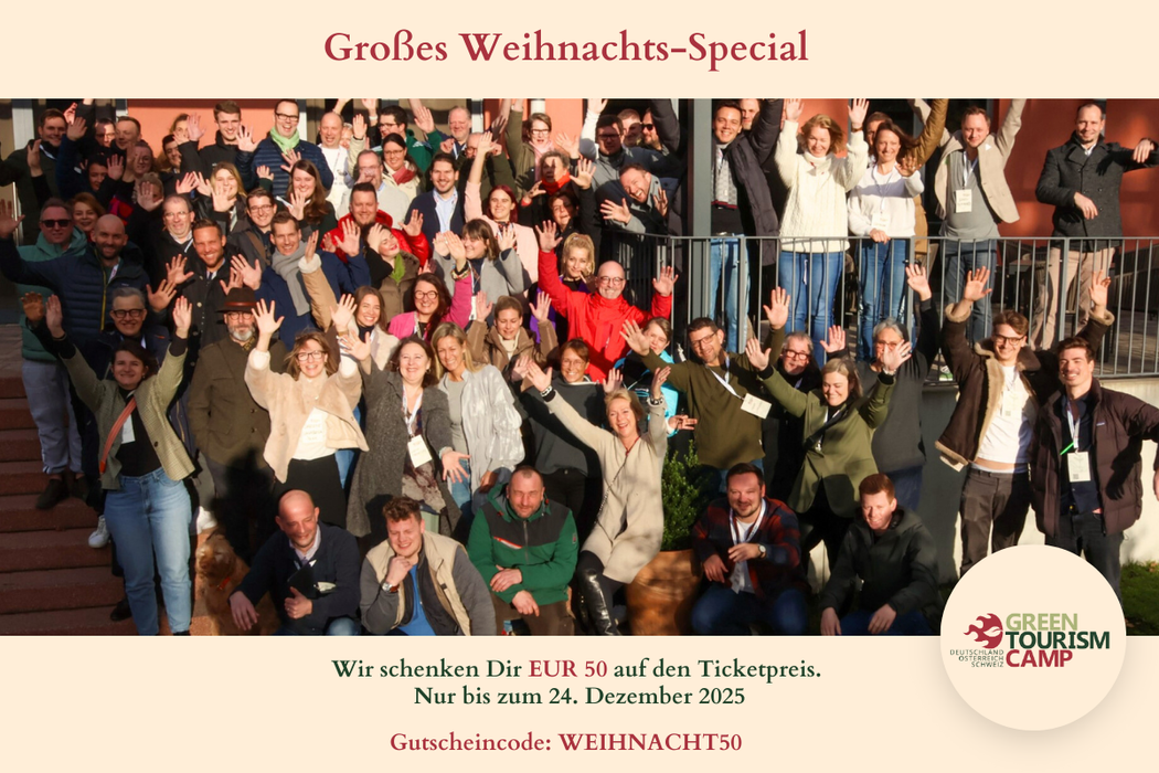 Passend zur Adventszeit macht das Green Tourism Camp der Branche ein verfrühtes Geschenk. Wer bis zum 24. Dezember 2025 bucht, spart mit dem Rabattcode WEIHNACHT50 direkt 50 Euro auf den Ticketpreis. Es ist die Einladung an alle, die Nachhaltigkeit nicht nur diskutieren, sondern aktiv gestalten und Teil einer Bewegung werden wollen, die den Tourismus von morgen verändert.